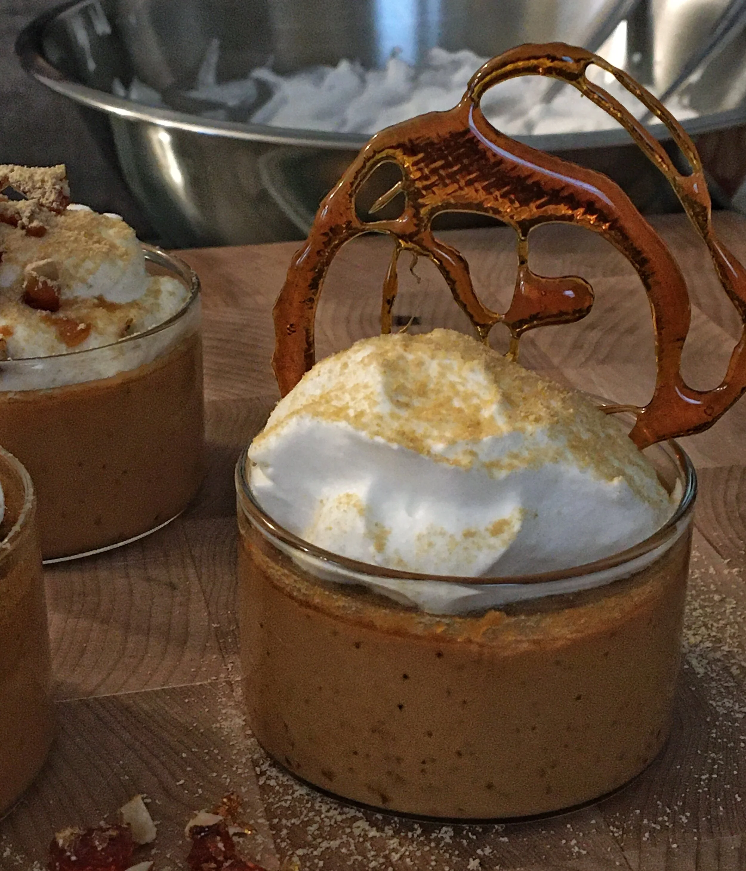 If you care to garnish or will be serving these PDC at a gathering, whipped cream is always a great choice, but here are a few other ideas. It could be fun to double down on the miso/soy theme by dusting the dessert with kinako, roasted soy flour. It’s got a nutty, almost peanut-like flavor and is often used in traditional Japanese sweets. Dust it on top of the whipped cream as you could cocoa powder. If you’re up for making more caramel, an easy decoration can be made by drizzling it on parchment or a silpat mat while it’s still hot to make lacy caramel pieces that will give your pot de cremes some nice height. Any extra caramel can be used to candy nuts like hazelnuts, which can add further crunch and flavor.