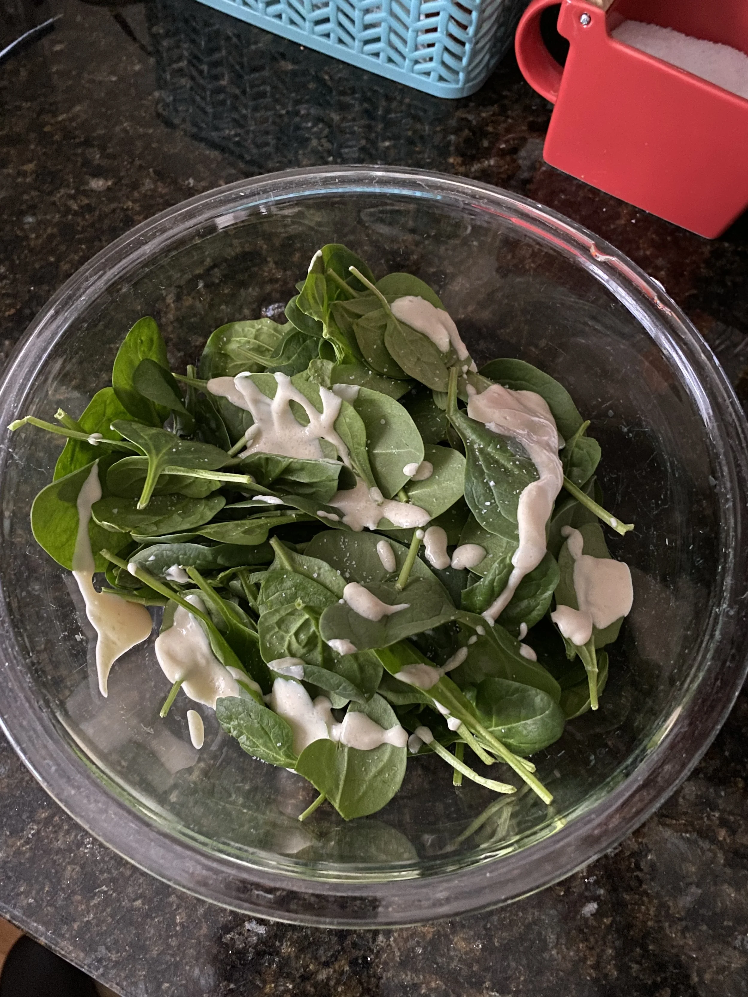 In a large bowl or salad bowl, dress the baby spinach with as much or as little dressing as you like along with a pinch of salt. You can finish the salad by either garnishing the large salad bowl with the warm mushrooms and sauce or make up individual plates. Serve and enjoy while the mushrooms and roasted vegetables are still warm and the baby spinach still crisp.